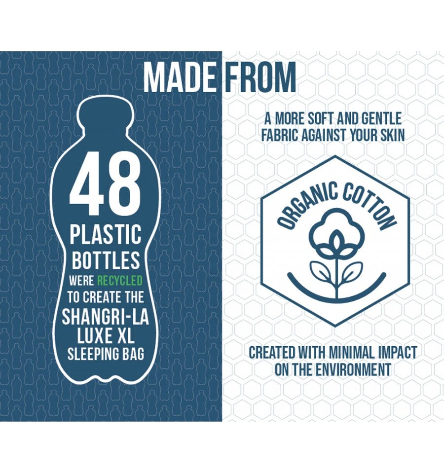 The Vango Shangri-La Collection has expanded into this beautiful new range of luxury sleeping bags to complement our award-winning Shangri-la mats for the ultimate night’s sleep. As part of our Earth Collection, this Shangri-La Luxe XL bag is longer and wider than standard singles and has been made using organic cotton and 100% recycled polyester, making it a more sustainable choice. This square shaped, XL sleeping bag with integrated headrest provides the extra space and comfort you need for the perfect sleep and the brushed organic cotton is hypo-allergenic and feels soft on your skin, much like your cosy winter bedding at home, soft, comfortable and warm to touch on a cold night. Machine washable at 30 degrees and comes in a compression carry bag for a smaller pack size and for easy storage. Sleep like royalty on your camping or campervan trips and use for everyday use when you have family of friends over to stay.