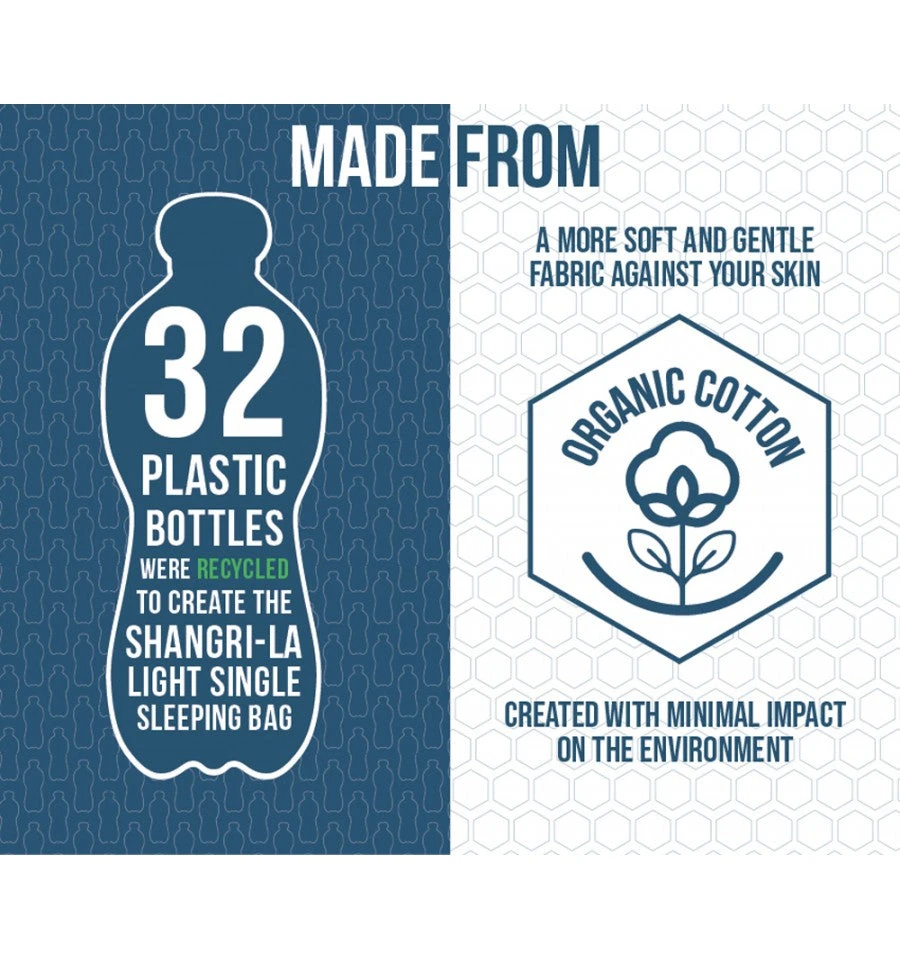 The Vango Shangri-La Collection has expanded into this beautiful new range of luxury sleeping bags to complement our award-winning Shangri-la mats for the ultimate night’s sleep. As part of our Earth Collection, the bag has been made using organic cotton and 100% recycled polyester, making it a more sustainable choice. This square shaped, single sleeping bag with integrated headrest provides the extra space and comfort you need for the perfect sleep and the organic cotton is hypo-allergenic and feels soft on your skin, much like your bedding at home and being cotton, keeps you cool and comfortable on a hot summers night. Machine washable at 30 degrees and comes in a compression carry bag for a smaller pack size and for easy storage. Sleep like royalty on your camping or campervan trips and use for everyday use when you have family of friends over to stay.